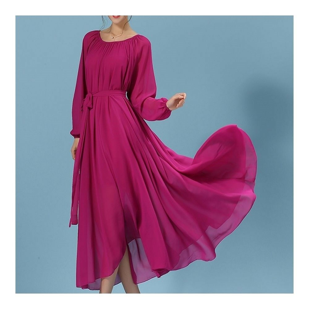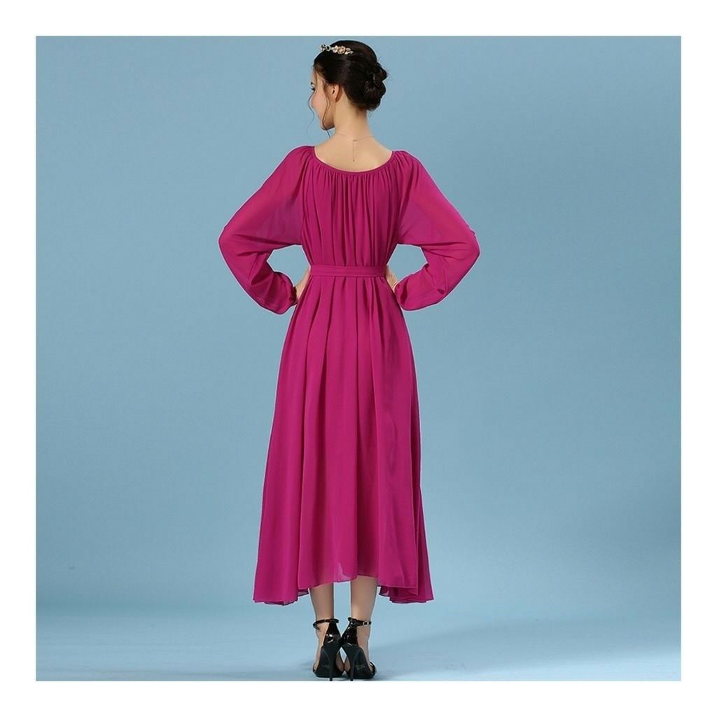 Long Sleeve Dress Bohemian Long Skirt Chiffon rose red S