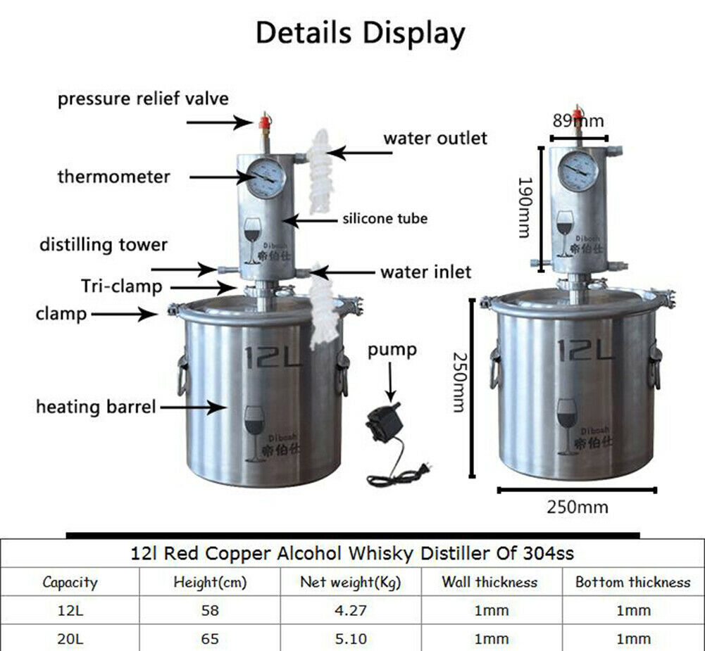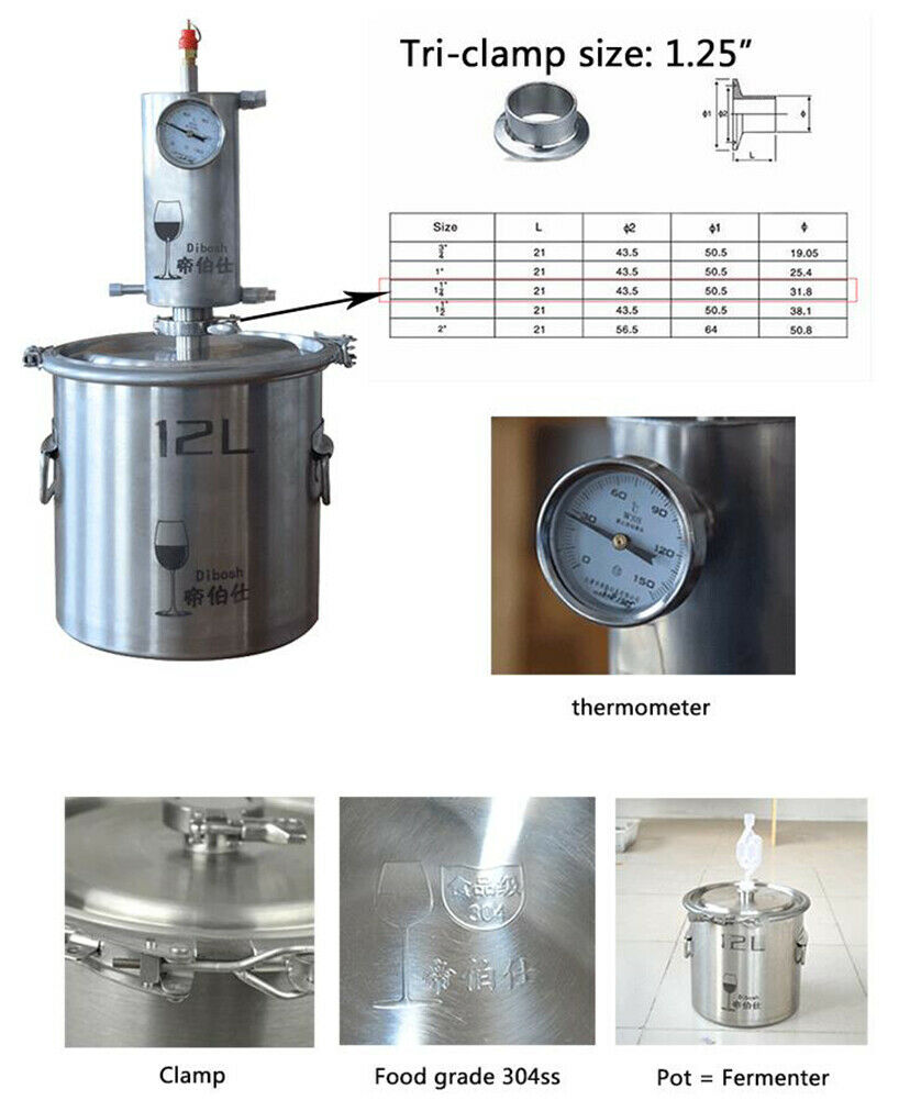 Description  Alcohol, ethanol, whiskey, spirits, water distilleries, wine making304 stainless steel, health and durableObserve the distillation temperature at all times with a...