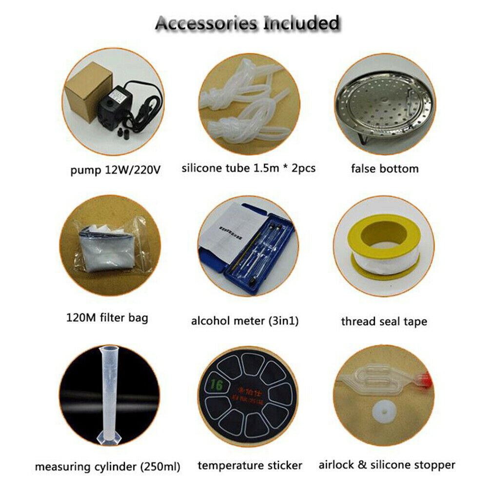 A set of distiller, water pump, water hose, filter bag, alcohol counter, raw material belt, 100ml measuring cylinder, temperature sticker, exhaust valve / silicone plug, rust holder