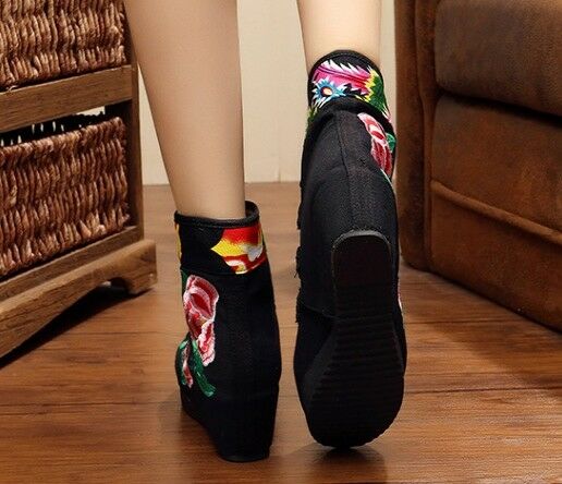 Four Shoelace Vintage Beijing Cloth Shoes Embroidered Boots black with cotton
